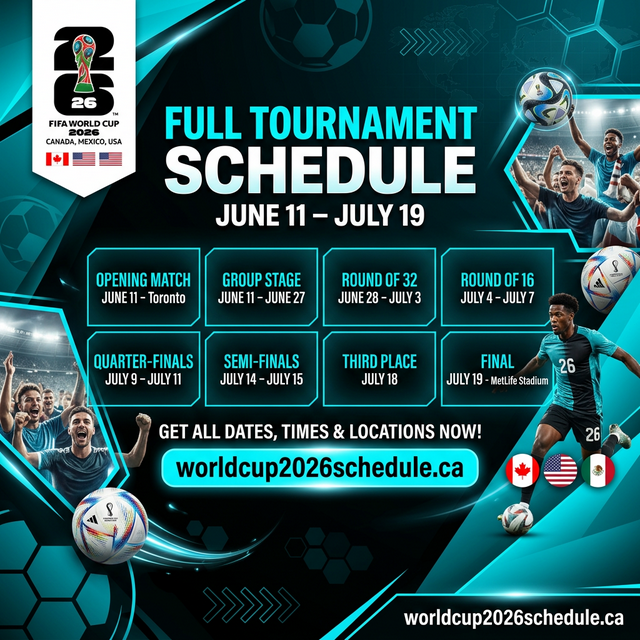 The FIFA World Cup 2026 is the 23rd edition of the tournament and the first with 48 teams. It runs from June 11 to July 19, 2026 across 16 venues. Canada, USA and Mexico are the three co-hosts. The opening match is at Estadio Azteca, Mexico City on June 11. Canada's home matches are at BC Place (Vancouver) and BMO Field (Toronto). The knockout rounds from July 4 are hosted exclusively in the USA. The final at MetLife Stadium on July 19 will be watched by an estimated 1.5 billion viewers worldwide. See the complete schedule, all 12 groups and the 16 match venues. See our World Cup 2026 match schedule FAQ.
